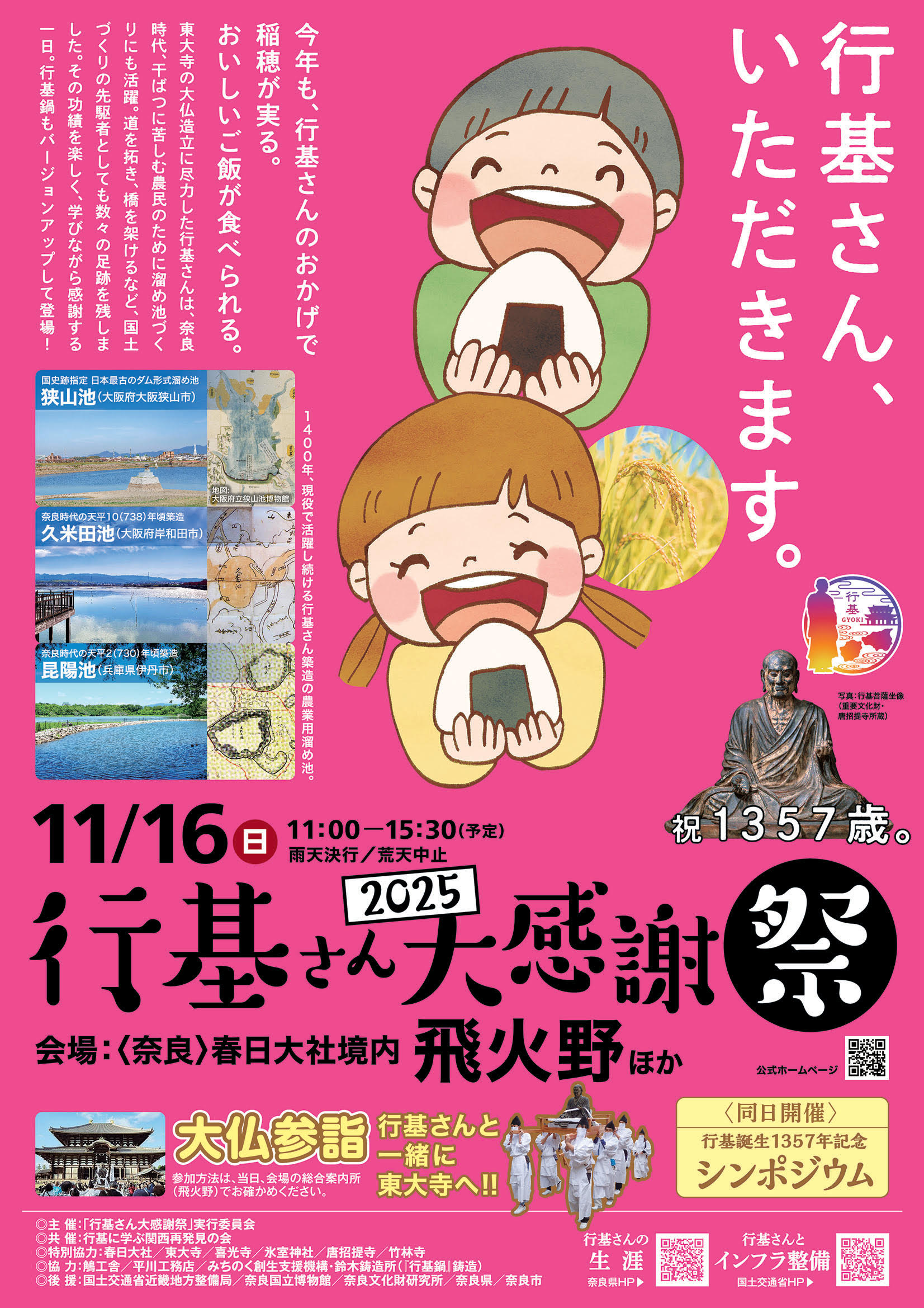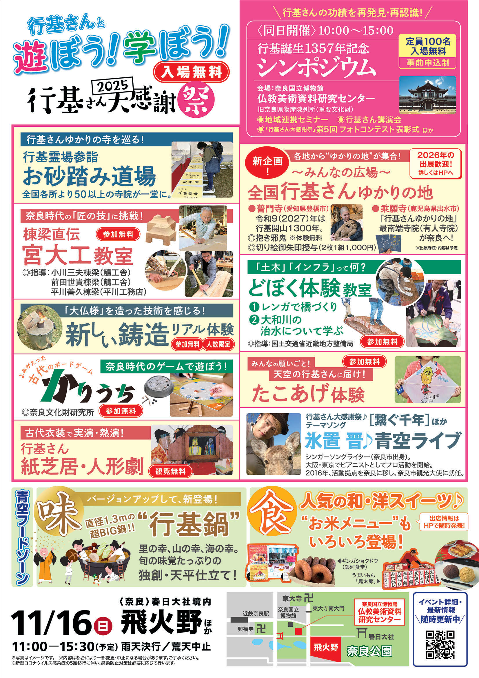 会場:奈良・春日大社境内飛火野ほか![[奈良] 11/12(日)10:00~14:30開催・『行基生誕1355年記念シンポジウム』~行基さん講演会・地域連携サミット~・まとめ☆彡 於:奈良国立博物館 仏教美術資料研究センタ 関野ホール・会場聴講(事前申込制 WEB・FAXにて/100名/締切11/11)・同時開催「行基さん大感謝祭」於:飛火野特設会場・主催:「行基さん大感謝祭」実行委員会・行基に学ぶ関西再発見の会・歴史遺産で繋がる自治体連絡調整会議](../img/gyoki_kansya_20251116_a.jpg)