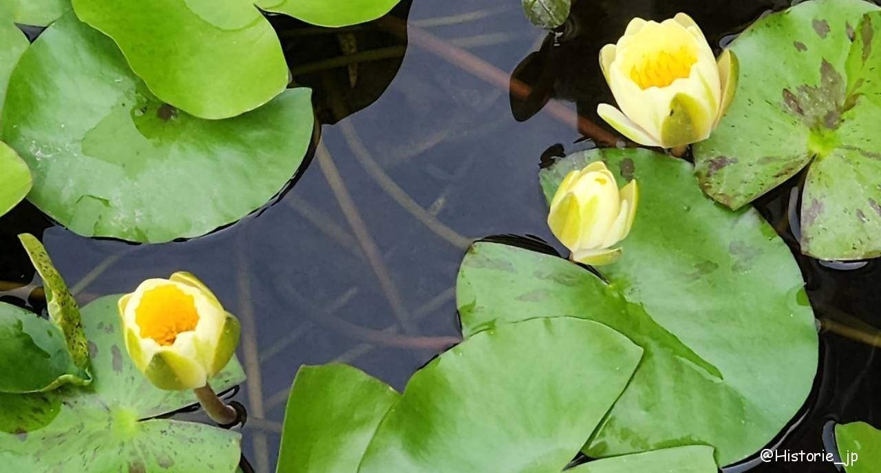 工芸館を背景に、おちついた ほっこりする空間、そこ池に 小ぶりながら 素敵な黄色の睡蓮ですね。